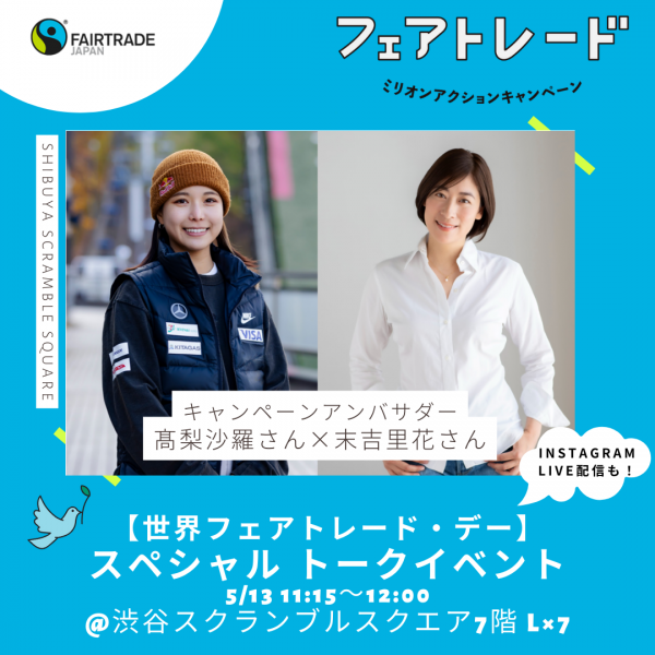 カテゴリーを絞る | 新着情報一覧 | お知らせ | ご報告 | フェアトレードニュース | 新着情報 【世界フェアトレード・デースペシャルトークイベント】キャンペーンアンバサダー髙梨沙羅さん×末吉里花さん(5/13 @渋谷スクランブルスクエア7階) 2023/05/11(木) 世界フェアトレード・デーである5月13日に、キャンペーンアンバサダーの髙梨沙羅さん×末吉里花さんお迎えして、フェアトレードとライフスタイル、スポーツのつながりなどについてお話ししていただきます!日時: 5月13日(土)11:15~12:00場所: 渋谷スクランブルスクエア 7階 L×7参加費は無料でどなたでもお越しいただけますので、お気軽にお越しください!フェアトレード・ジャパンInstagramにてインスタライブも予定しています! <<戻る