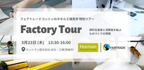 フェアトレード・ラベル・ジャパンは「ミリオンアクションキャンペーン2024」の一環として、ホットマン株式会社のご協力のもと、学生を対象にフェアトレードコットンのタオル工場を見学できる特別ツアーを、5月23日(木)に東京都青梅市のホットマン株式会社本社・工場にて開催いたします。学生の皆さまはPeatixよりお申込みの上、ぜひご参加ください!