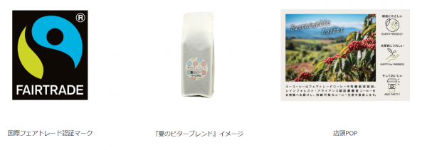 ~『夏のビターブレンド』は、国際フェアトレード認証を受けたブラジルとコロンビアのコーヒー豆を100%使用し、短時間でフレンチローストまで焙煎することで、しっかりとした苦みと重厚感のある味わいに仕上げました。ホットコーヒーはもちろんアイスコーヒーとしてもお楽しみいただけます。一杯のコーヒーでサステナブルな活動に貢献できる、夏限定のブレンドコーヒーをお楽しみください。~