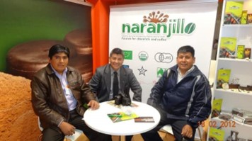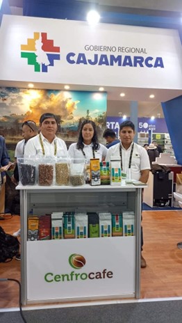 ハビエル(左)と同僚たち。2023年カハマルカ地方政府の旗の下でコーヒー製品を展示するCENFROCAFEのブースで。